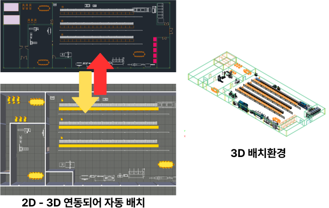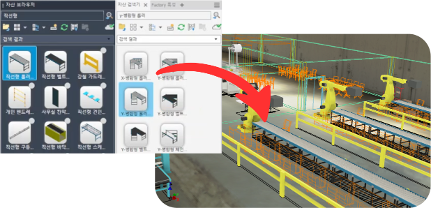 Factory Design Utility의 실시간 시뮬레이션 기능은 설계자가 공장의 운영 효율성을 사전에 검토할 수 있도록 돕습니다. 이 기능을 통해 설계 단계에서부터 공장의 물류 흐름, 장비 간 간섭, 작업자 동선 등을 시뮬레이션할 수 있습니다.
